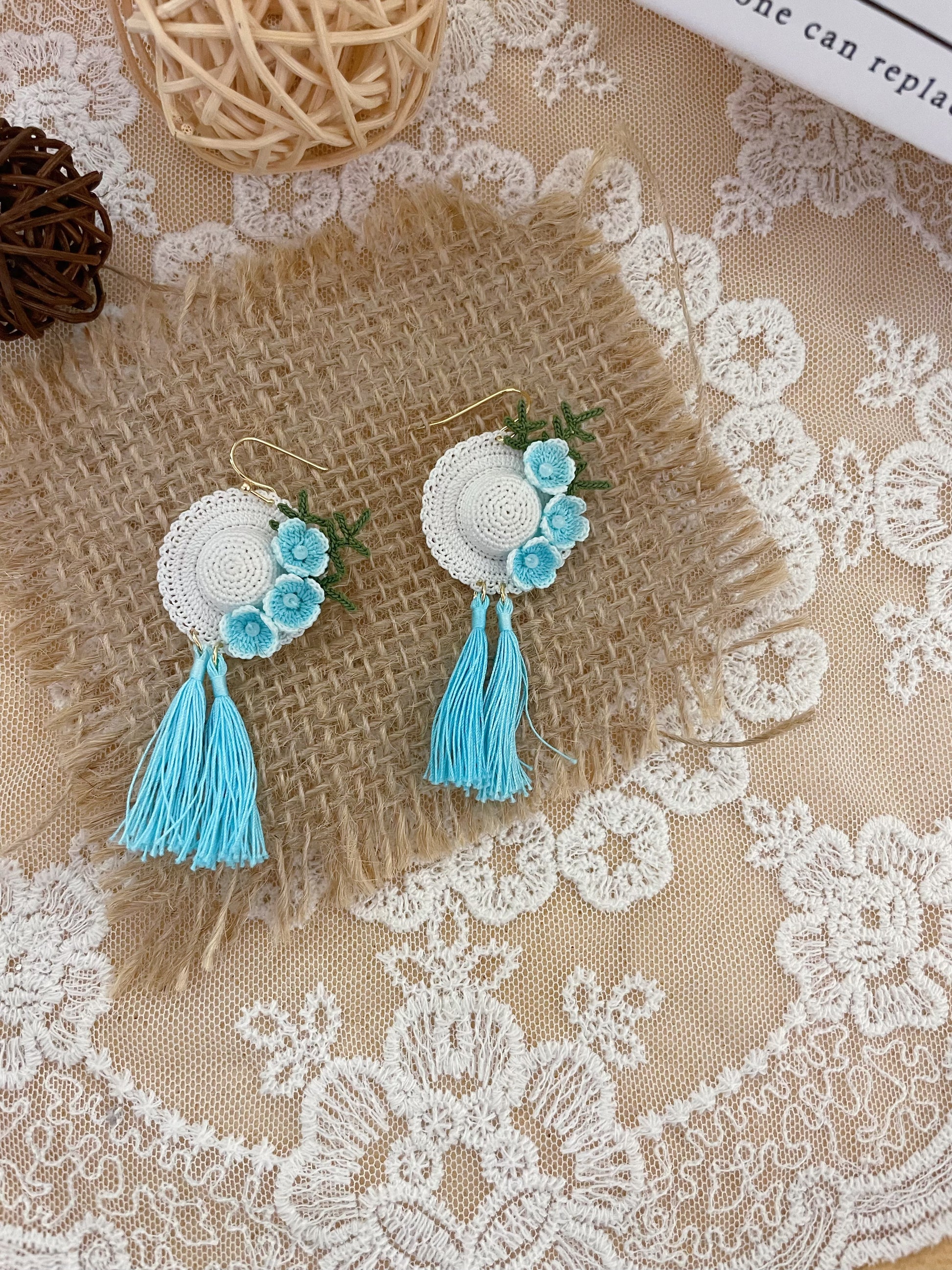 These handmade crochet earrings are designed in the shape of white straw hats, each adorned with small light blue flowers and green leaves on one side. Long, sky-blue tassels hang from the bottom, adding a playful and breezy feel. The earrings are displayed on a round woven mat, enhancing their charming, rustic, and summery vibe.